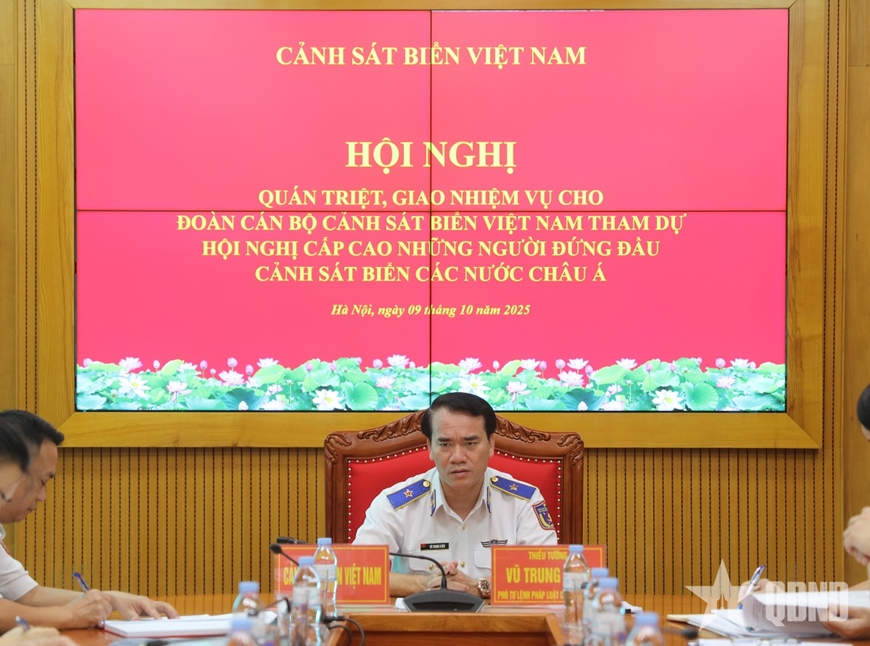 Ngày 9-10, Cảnh sát biển Việt Nam tổ chức Hội nghị quán triệt, giao nhiệm vụ cho đoàn công tác Cảnh sát biển Việt Nam tham dự Hội nghị cấp cao những người đứng đầu Cảnh sát biển các nước châu Á lần thứ 21 (HACGAM - 21). Thiếu tướng Vũ Trung Kiên, Phó tư lệnh Pháp luật Cảnh sát biển Việt Nam chủ trì Hội nghị và phát biểu giao nhiệm vụ cho đoàn công tác.