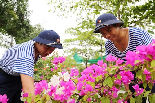 Chiến sĩ chăm sóc vườn hoa, cây cảnh tại đơn vị.