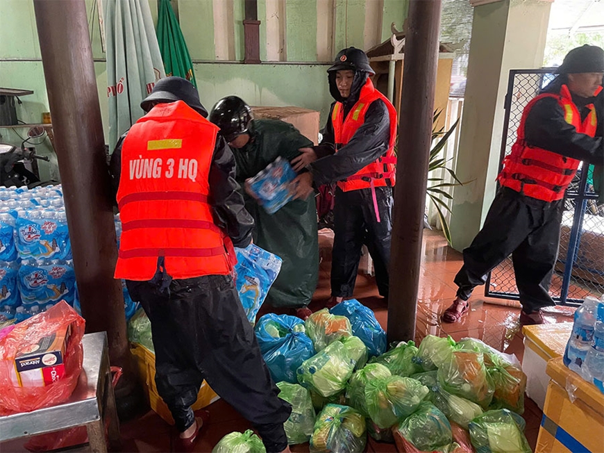 | Cán bộ, chiến sĩ Bộ tư lệnh Vùng 3 Hải quân chuẩn bị lương thực, thực phẩm hỗ trợ nhân dân vùng ngập lụt. |