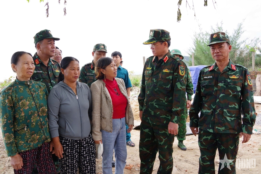 Tại các điểm thi công, Thiếu tướng Lương Đình Chung trực tiếp thăm hỏi, nắm tình hình đời sống, sinh hoạt, điều kiện làm việc của cán bộ, chiến sĩ; đồng thời kiểm tra tiến độ, chất lượng các công trình nhà ở đang được xây dựng cho các hộ dân bị ảnh hưởng nặng nề bởi mưa lũ.
