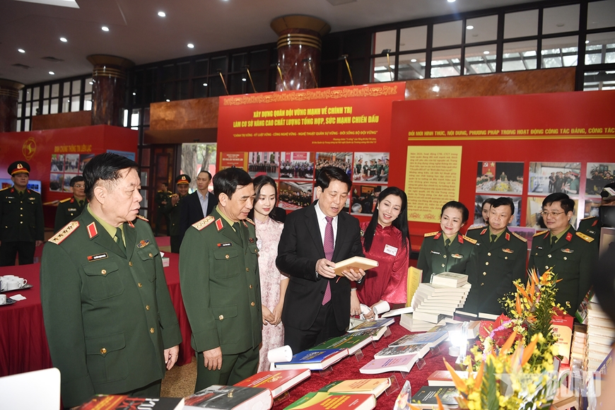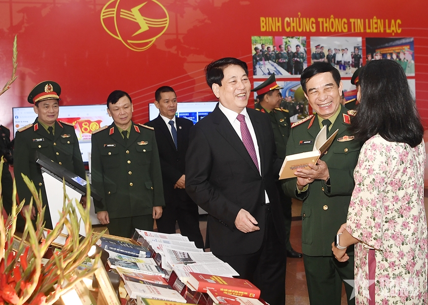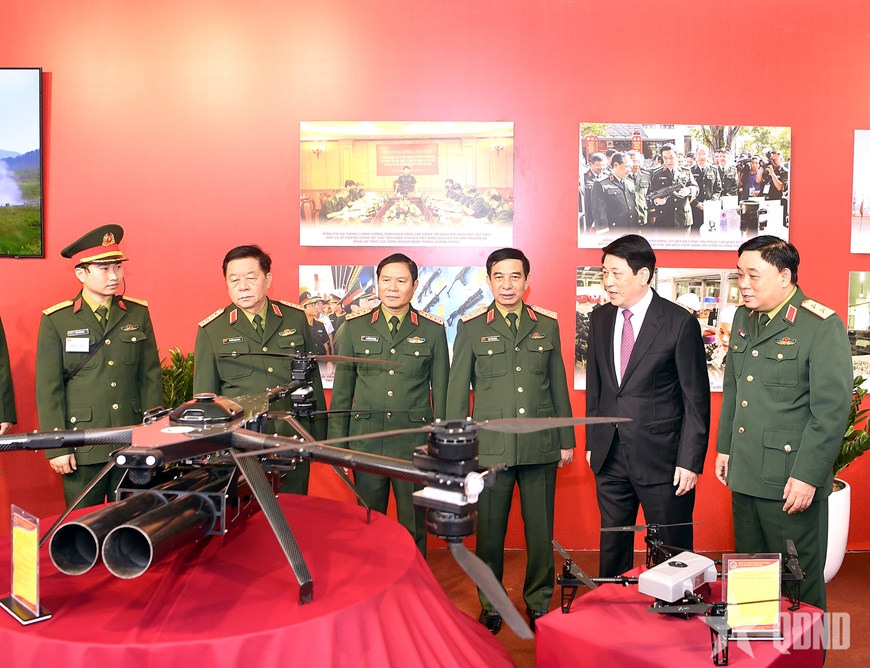 Chủ tịch nước Lương Cường và lãnh đạo Bộ Quốc phòng tham quan các gian trưng bày tại hội nghị.