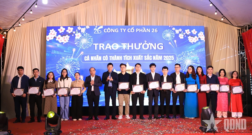 | Đại tá Trịnh Xuân Hiếu, Chủ tịch Hội đồng quản trị Công ty Cổ phần 26 (thứ năm, từ phải sang) trao khen thưởng tặng các cá nhân có thành tích xuất sắc năm 2025. |