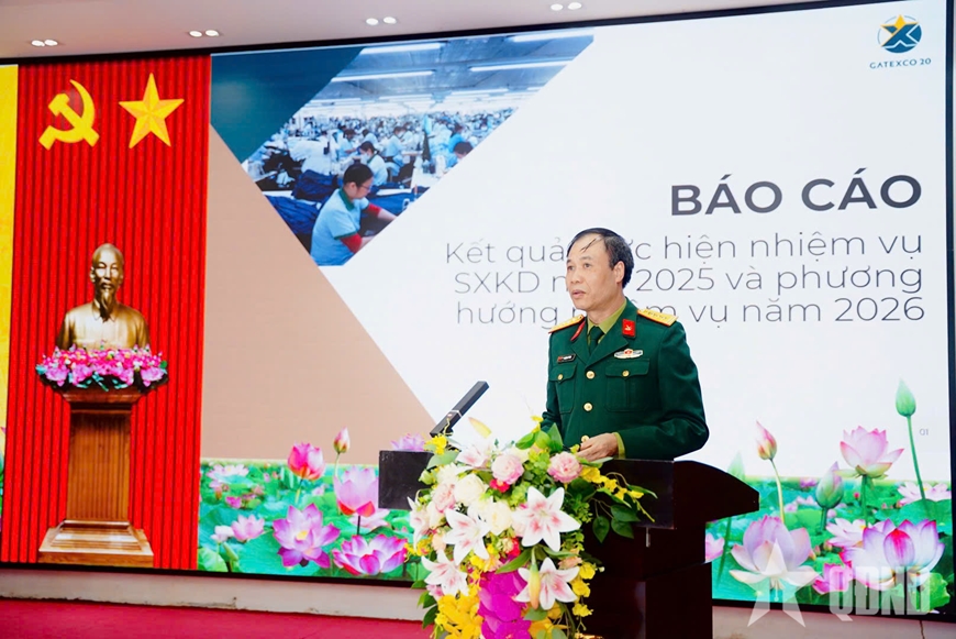 | Đại tá Hoàng Sỹ Tâm, Phó bí thư Đảng ủy, Tổng giám đốc Công ty Cổ phần X20 trình bày báo cáo kết quả sản xuất kinh doanh năm 2025. |