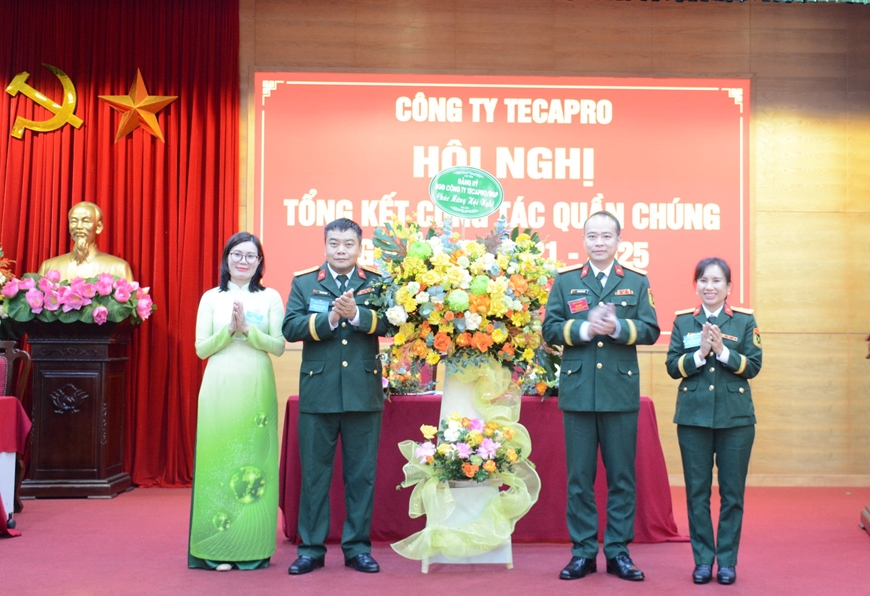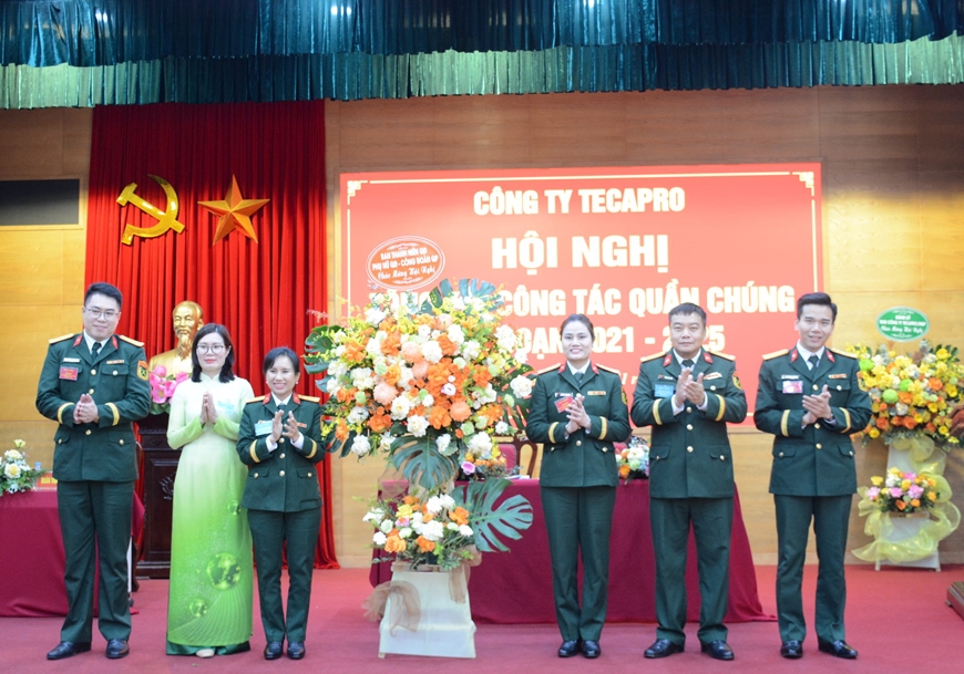 | Đại tá Hoàng Anh Tuấn, Bí thư Đảng ủy, Chủ tịch Công ty TECAPRO (thứ hai từ phải sang) thay mặt lãnh đạo Công ty tặng hoa chúc mừng hội nghị. |