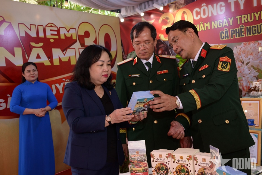 Thượng tá Lê Trung Thành, Giám đốc Công ty TNHH MTV Cà phê 15 (ngoài cùng bên phải) giới thiệu các sản phẩm cà phê của đơn vị với thủ trưởng Bộ tư lệnh Quân khu 5 và lãnh đạo tỉnh Đắk Lắk.