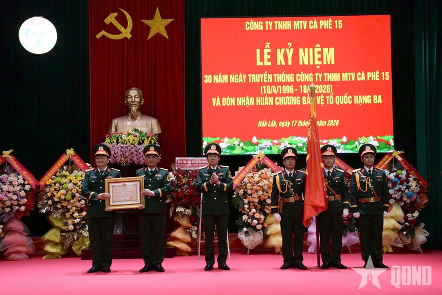 | Thừa ủy quyền của Chủ tịch nước, Thiếu tướng Lương Đình Chung, Bí thư Đảng ủy, Chính ủy Quân khu 5 trao Huân chương Bảo vệ Tổ quốc hạng Ba tặng Công ty TNHH MTV Cà phê 15. |