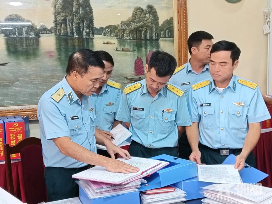 | Thiếu tướng Ngô Quốc Chung, Phó chủ nhiệm Chính trị Quân chủng PK-KQ kiểm tra sổ sách CTĐ, CTCT khối cơ quan Sư đoàn 363. |