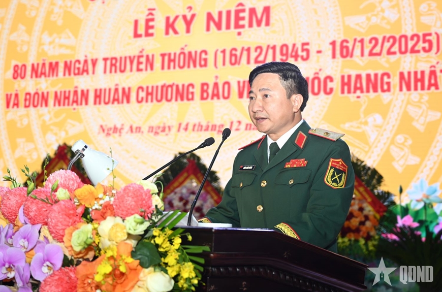 | Thiếu tướng Phạm Văn Đông, Chủ nhiệm Chính trị Quân khu 4 trình bày diễn văn kỷ niệm. |