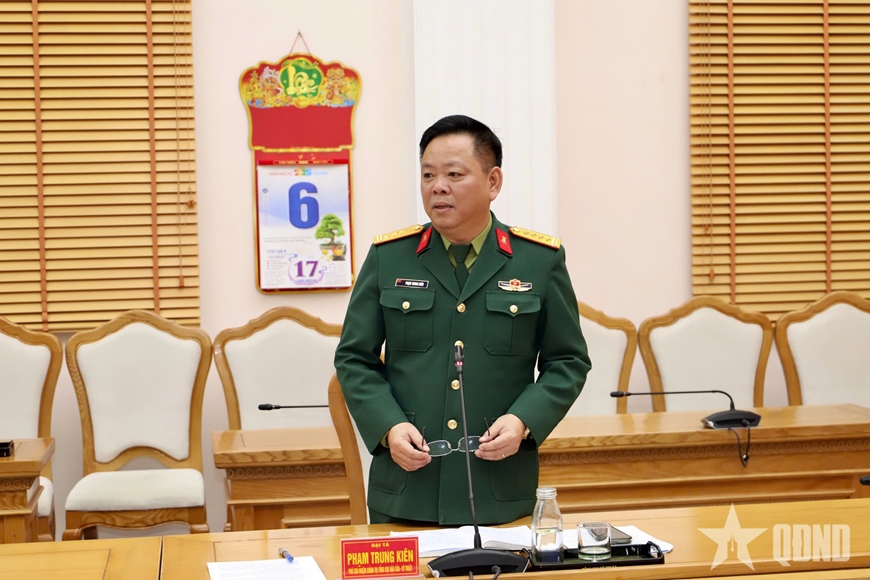 | Đại tá Phạm Trung Kiên, Bí thư Đảng ủy, Phó cục trưởng Cục Chính trị, Tổng cục HC-KT phát biểu tại hội nghị. |