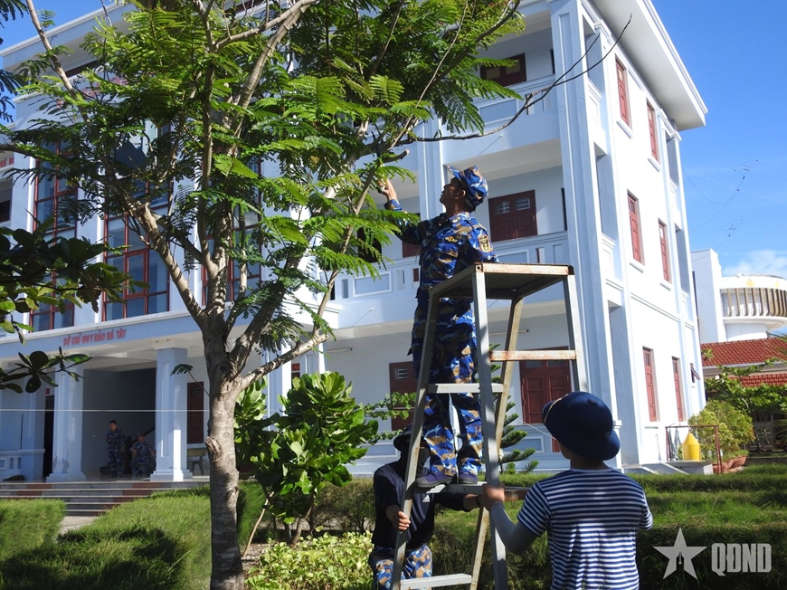 | Chiến sĩ đảo Đá Tây cắt tỉa cây xanh. |