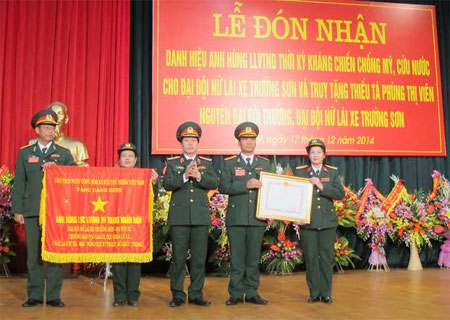 QĐND Online - Sáng 17-12, Đảng ủy, lãnh đạo Trường Cao đẳng ô tô (Tổng cục Kỹ thuật) tổ chức Lễ đón nhận danh hiệu Anh hùng LLVT nhân dân thời kỳ kháng chiến chống Mỹ cứu nước cho Đại đội Nữ lái xe Trường Sơn và truy tặng Đại đội trưởng Phùng Thị Viên danh hiệu Anh hùng LLVT nhân dân. Thiếu tướng Nguyễn Hữu Chính, Phó chính ủy Tổng cục Kỹ thuật dự. Bộ trưởng Phùng Quang Thanh gửi lẵng hoa chúc mừng.