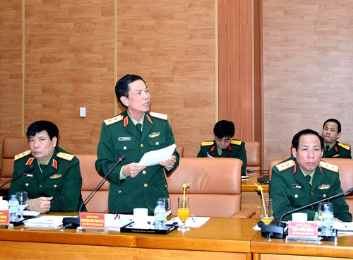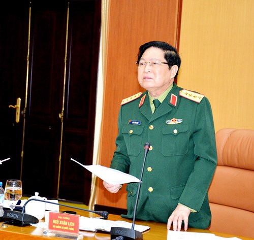 Đại tướng Ngô Xuân Lịch, Ủy viên Bộ Chính trị, Phó Bí thư Quân ủy Trung ương, Bộ trưởng Bộ Quốc phòng phát biểu chỉ đạo tại buổi làm việc. |