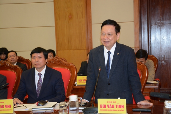 Đồng chí Bùi Văn Tỉnh, Bí thư Tỉnh ủy tỉnh Hòa Bình, phát biểu tại buổi làm việc.