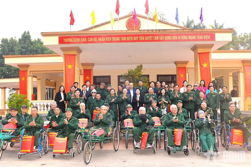 Thay mặt Quân ủy Trung ương, lãnh đạo Bộ Quốc phòng, Đại tướng Nguyễn Tân Cương trao quà, chúc các thương binh, bệnh binh và tập thể cán bộ, công nhân viên Trung tâm đón Tết vui tươi, đầm ấm.