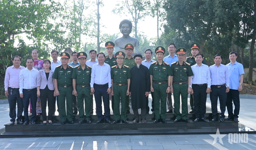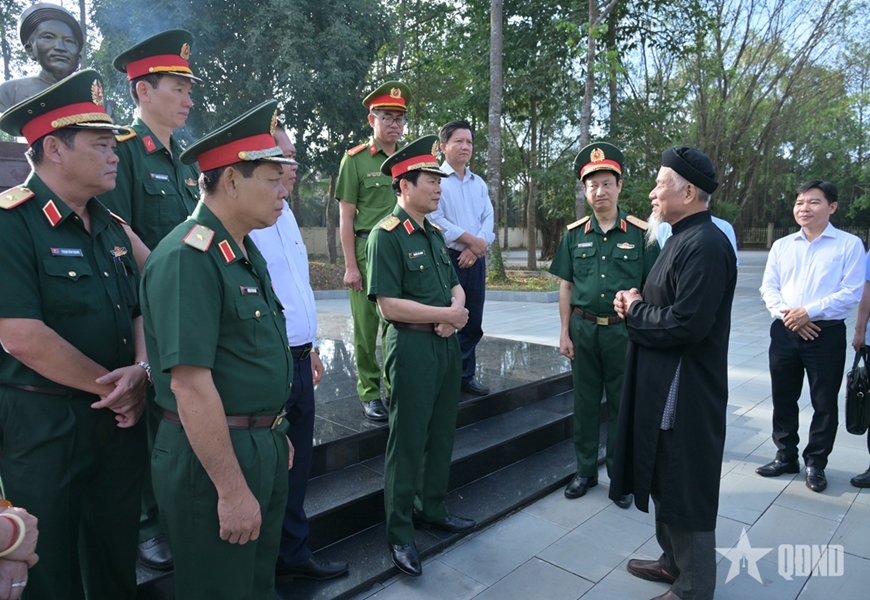 | Đại tướng Nguyễn Tân Cương và các đại biểu tại Đền thờ Anh hùng dân tộc, Thủ khoa Nguyễn Hữu Huân. |