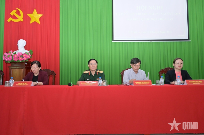 | Đại tướng Nguyễn Tân Cương và các ứng cử viên đại biểu Quốc hội tại hội nghị tiếp xúc cử tri. |