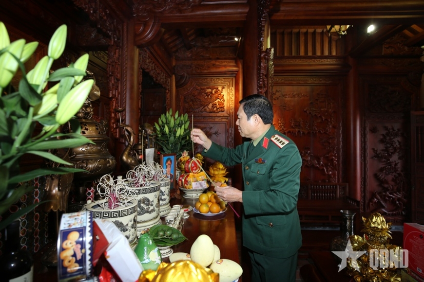 Đại tướng Nguyễn Tân Cương và đoàn công tác thành kính dâng hương tri ân những cống hiến, đóng góp to lớn của các đồng chí nguyên lãnh đạo Đảng, Nhà nước, Quân đội đối với sự nghiệp cách mạng của Đảng, dân tộc và sự nghiệp xây dựng Quân đội, củng cố quốc phòng.