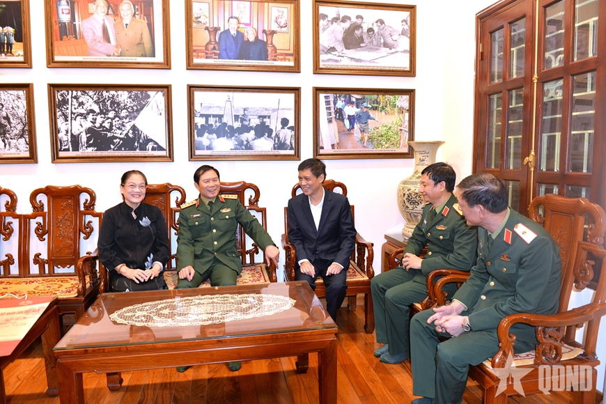 | Đại tướng Nguyễn Tân Cương thăm hỏi, trò chuyện với thân nhân Thượng tướng Nguyễn Khắc Nghiên. |