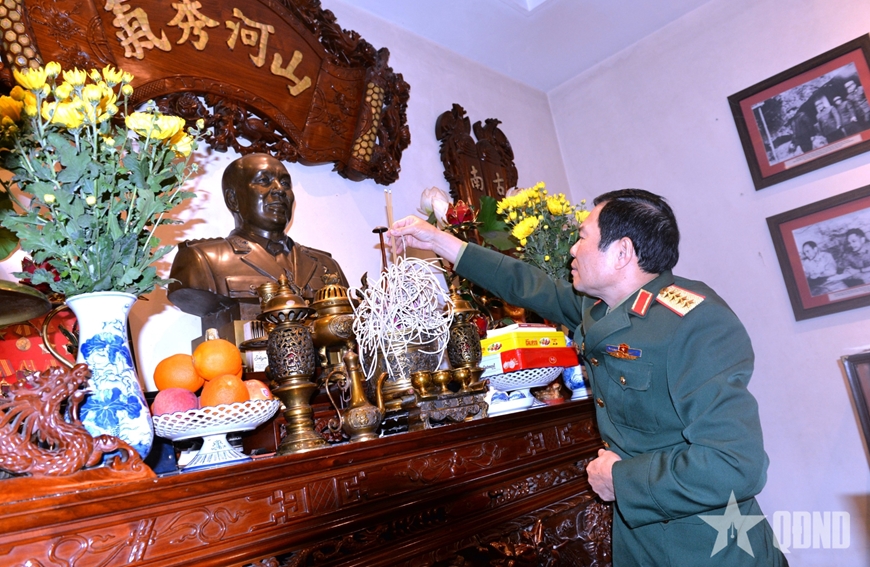 | Đại tướng Nguyễn Tân Cương thắp hương tưởng nhớ Đại tướng Văn Tiến Dũng. |