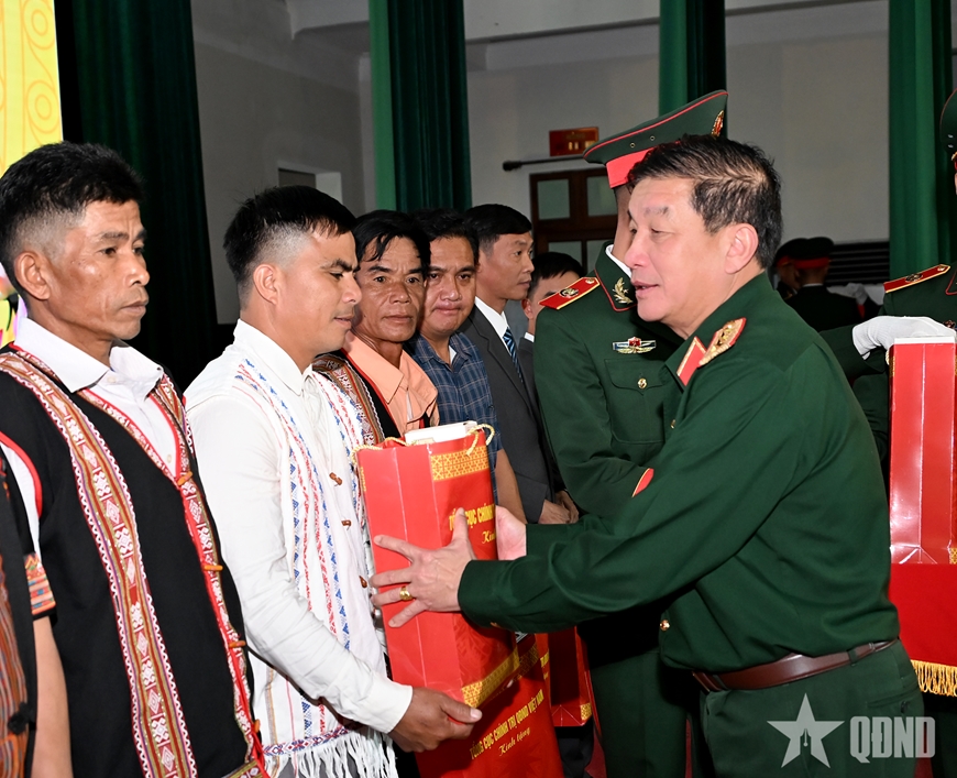 | Lãnh đạo Quân đoàn 34 và Binh đoàn 15 trao quà tặng các già làng, trưởng bản, trưởng thôn, người có uy tín, chức sắc tôn giáo. |