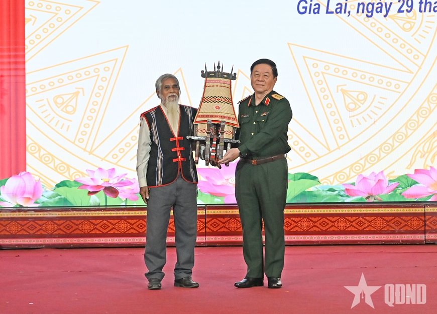 | Đại diện già làng trao quà tặng Đại tướng Nguyễn Trọng Nghĩa. |