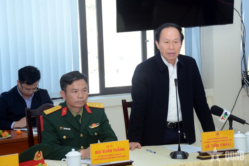 | Đồng chí Lê Tiến Châu, Ủy viên Trung ương Đảng, Bí thư Thành ủy, Trưởng Đoàn đại biểu Quốc hội TP Hải Phòng phát biểu tại buổi làm việc. |