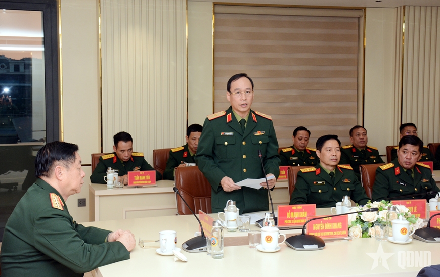 | Thiếu tướng Đỗ Mạnh Khảm, Phó bí thư Đảng ủy, Tư lệnh Binh đoàn 19 báo cáo kết quả thực hiện nhiệm vụ của đơn vị với Đại tướng Nguyễn Trọng Nghĩa và đoàn công tác. |