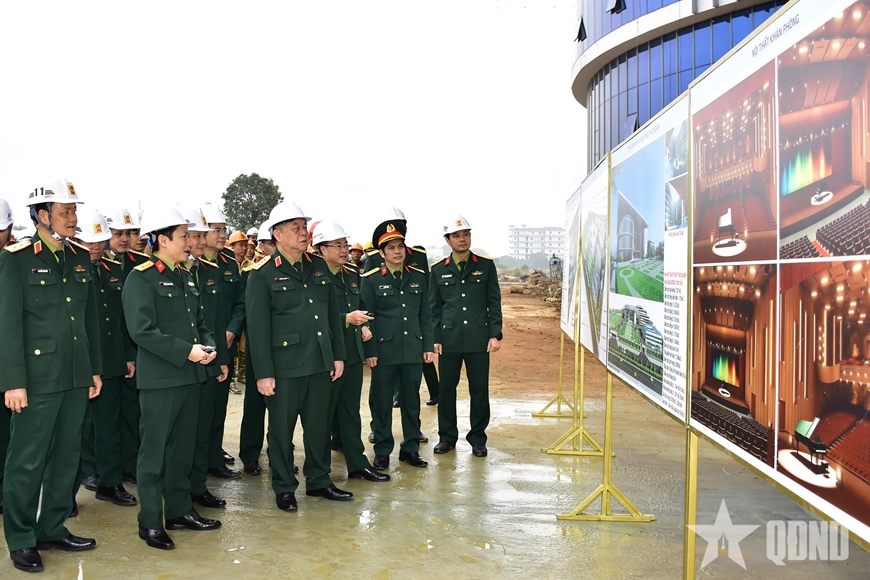 Tại Trường Đại học Văn hóa Nghệ thuật Quân đội (cơ sở Hòa Lạc), Đại tướng Nguyễn Trọng Nghĩa kiểm tra công tác thi công dự án Nhà hát Nghệ thuật thực nghiệm.