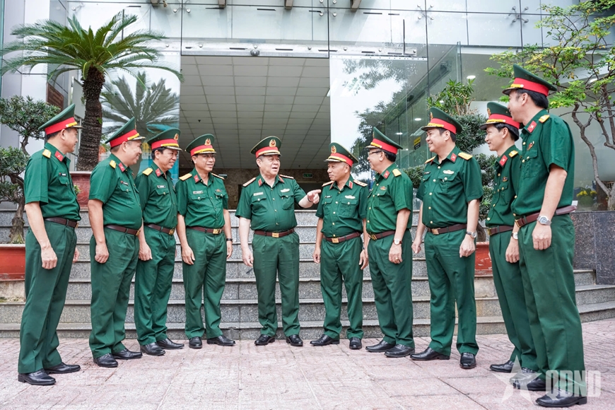 Đại tướng Nguyễn Trọng Nghĩa và đoàn công tác cùng chỉ huy các cơ quan báo chí, xuất bản thuộc Tổng cục Chính trị tại TP Hồ Chí Minh. Ảnh: NGUYỄN TRUNG TRỰC