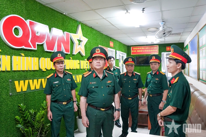 | Đại tướng Nguyễn Trọng Nghĩa và đoàn công tác thăm Cơ quan đại diện Trung tâm Phát thanh - Truyền hình Quân đội tại TP Hồ Chí Minh. Ảnh: NGUYỄN TRUNG TRỰC |