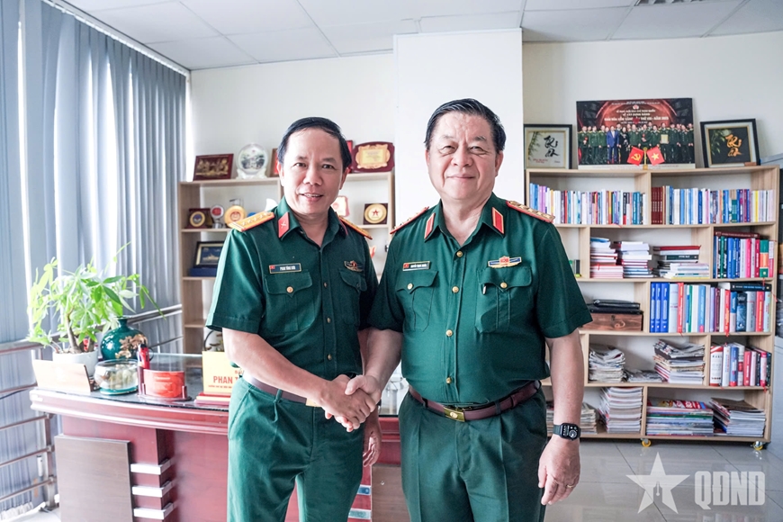 Đại tá Phan Tùng Sơn, Trưởng ban đại diện Báo Quân đội nhân dân tại TP Hồ Chí Minh tiếp đón Đại tướng Nguyễn Trọng Nghĩa tại cơ quan. Ảnh: NGUYỄN TRUNG TRỰC