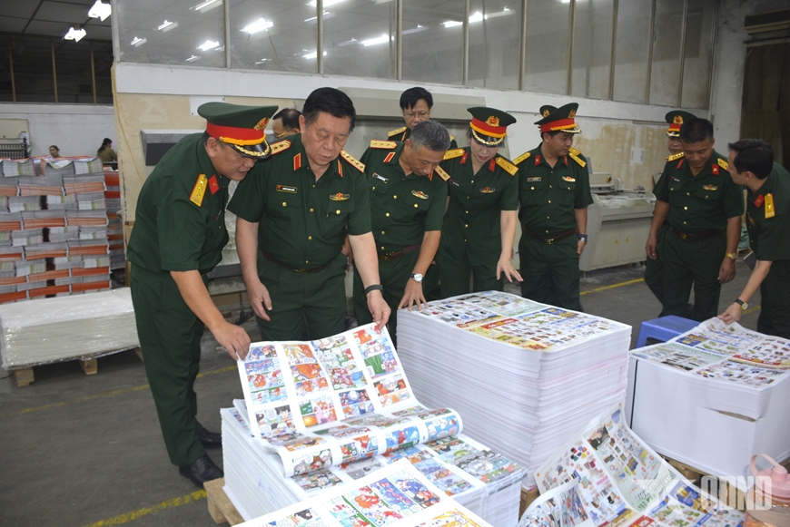 | Đại tướng Nguyễn Trọng Nghĩa kiểm tra sản phẩm tại Nhà máy In Quân đội 2. Ảnh: NGỌC ANH |