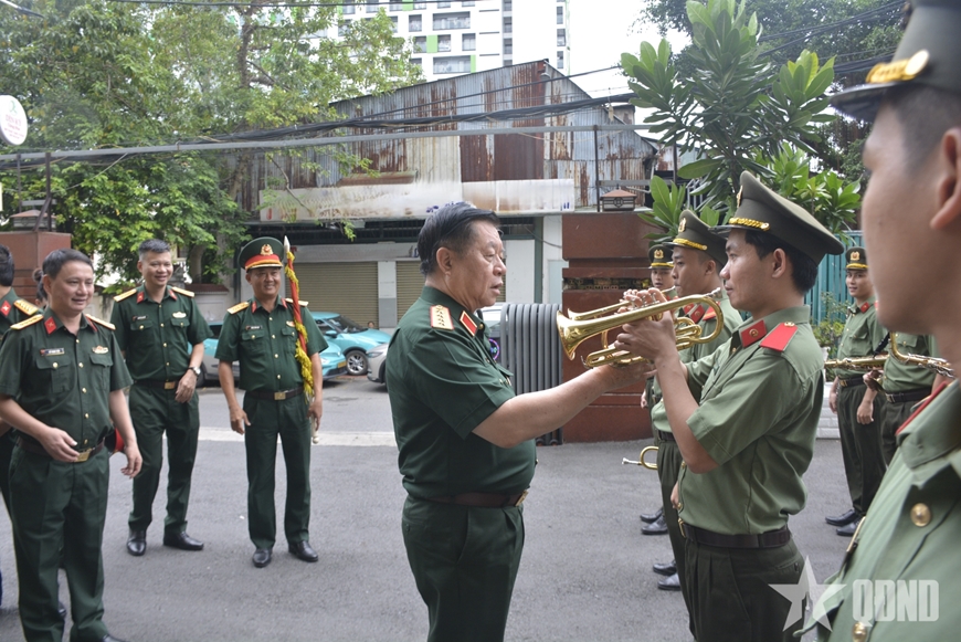 Đại tướng Nguyễn Trọng Nghĩa động viên học viên An ninh nhân dân đang đào tạo quân nhạc tại Trường Đại học Văn hóa - nghệ thuật Quân đội (cơ sở 2). Ảnh: NGỌC ANH