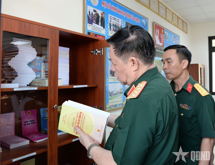 Đại tướng Nguyễn Trọng Nghĩa kiểm tra tủ sách tại Phòng Hồ Chí Minh của Cụm 31, Trung tâm 386.