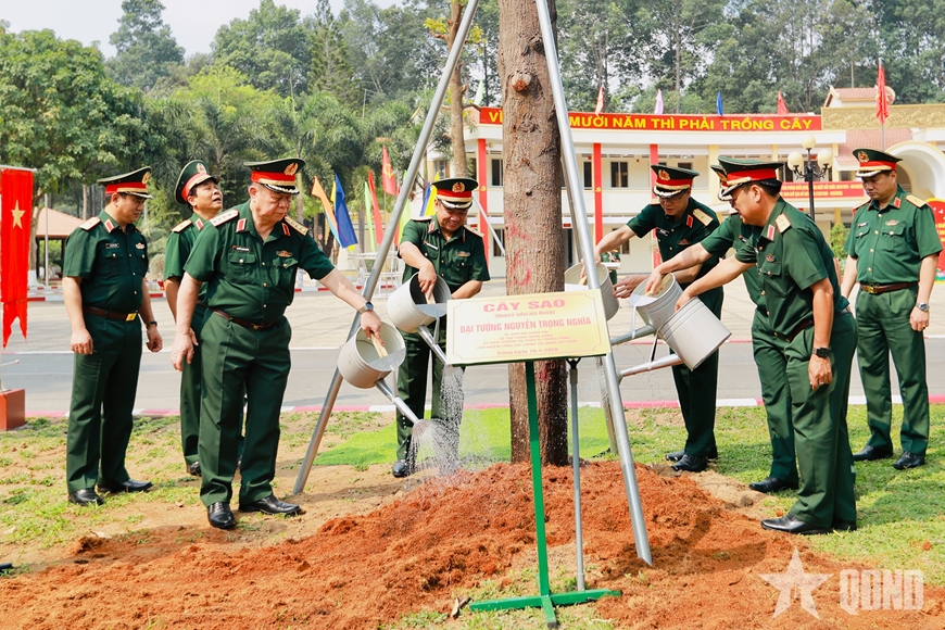 | Đại tướng Nguyễn Trọng Nghĩa và các đại biểu trồng cây lưu niệm tại khuôn viên trường. |