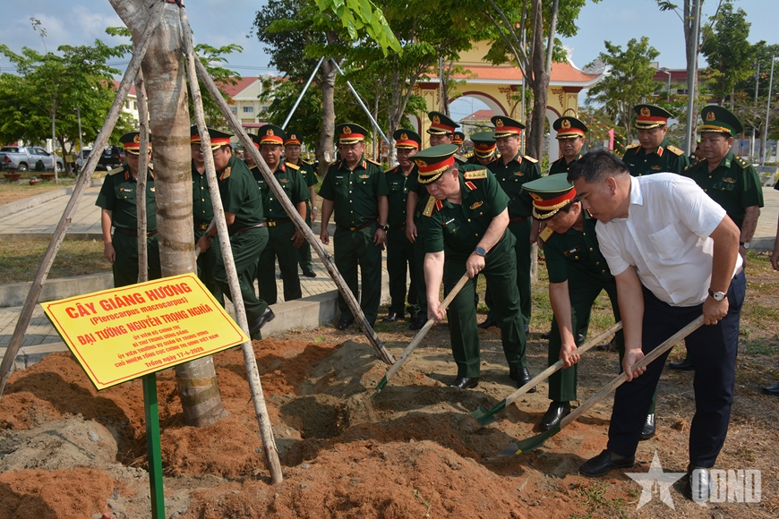 | Đại tướng Nguyễn Trọng Nghĩa và các đại biểu trồng cây lưu niệm trong khuôn viên Đền thờ Anh hùng liệt sĩ Chiến khu Rừng Sác. |
