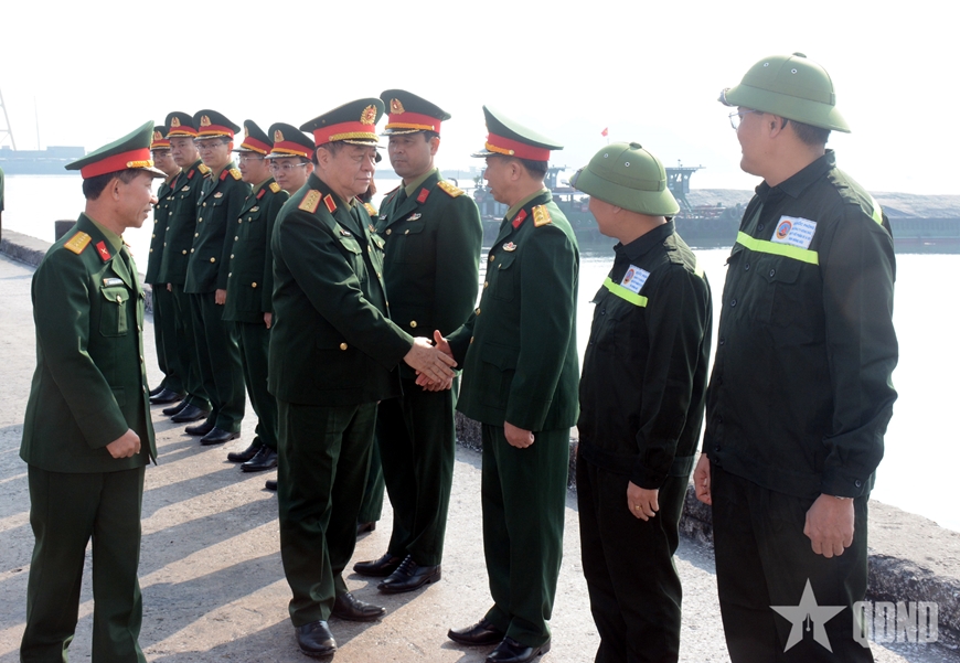 | Đại tướng Nguyễn Trọng Nghĩa nghe lãnh đạo Công ty cổ phần Vận tải và Chế biến than Đông Bắc giới thiệu khái quát về tình hình hoạt động sản xuất, kinh doanh. |