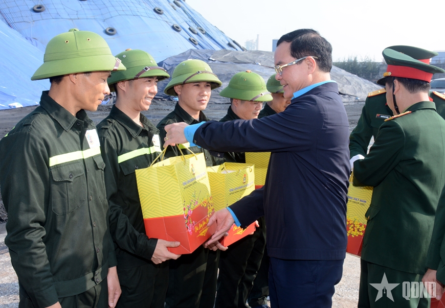 | Đại tướng Nguyễn Trọng Nghĩa trao quà Tết tặng đại diện người lao động Công ty cổ phần Vận tải và Chế biến than Đông Bắc. |