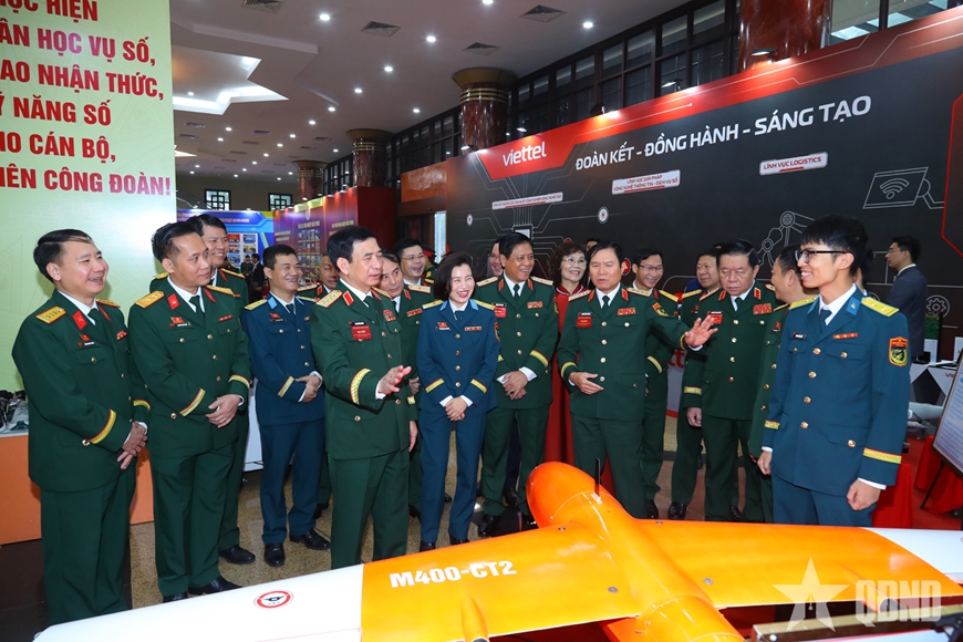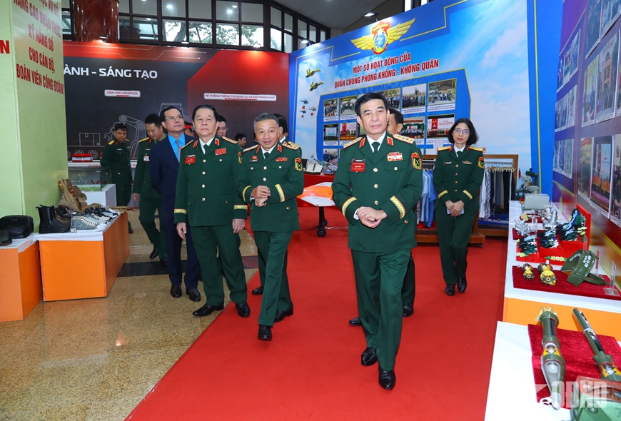 Đại tướng Phan Văn Giang và các đại biểu tham quan khu vực trưng bày các mô hình, sản phẩm, sáng kiến chào mừng đại hội.