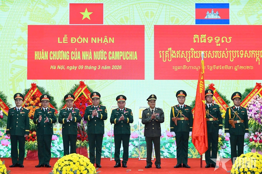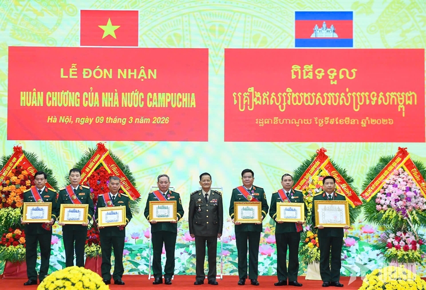 | Đại tướng Prum Din, Quốc vụ khanh Bộ Quốc phòng Campuchia trao Huân chương Hữu nghị tặng các tập thể và cá nhân thuộc Tổng cục II. |