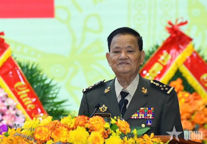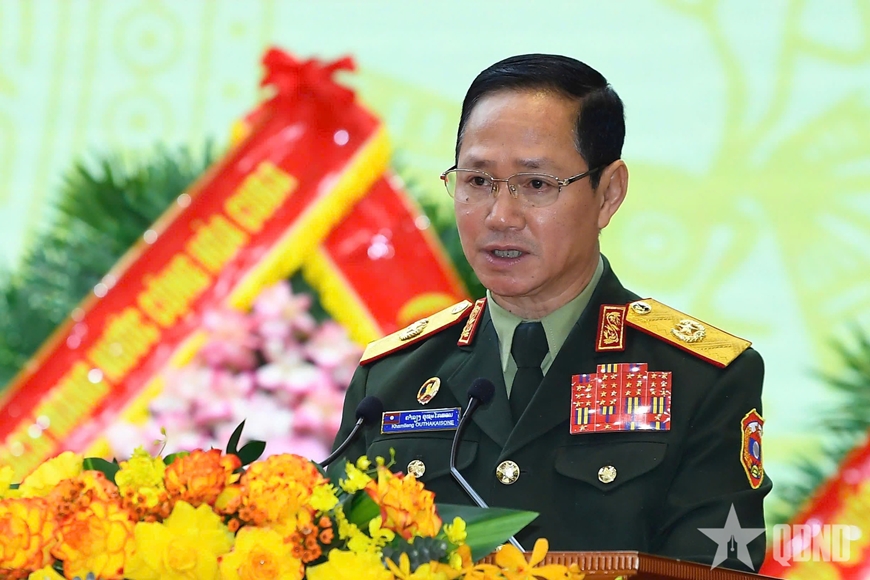 | Đại tướng Khamliang Outhakaysone, Bộ trưởng Bộ Quốc phòng Lào phát biểu tại buổi lễ. |