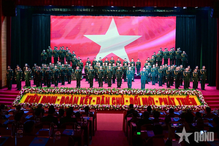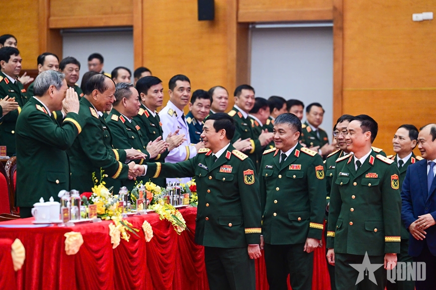 Đại tướng Phan Văn Giang và các đại biểu dự buổi Lễ kỷ niệm 50 năm Ngày truyền thống và đón nhận Huân chương Bảo vệ Tổ quốc hạng Nhất của Trường Sĩ quan Chính trị.