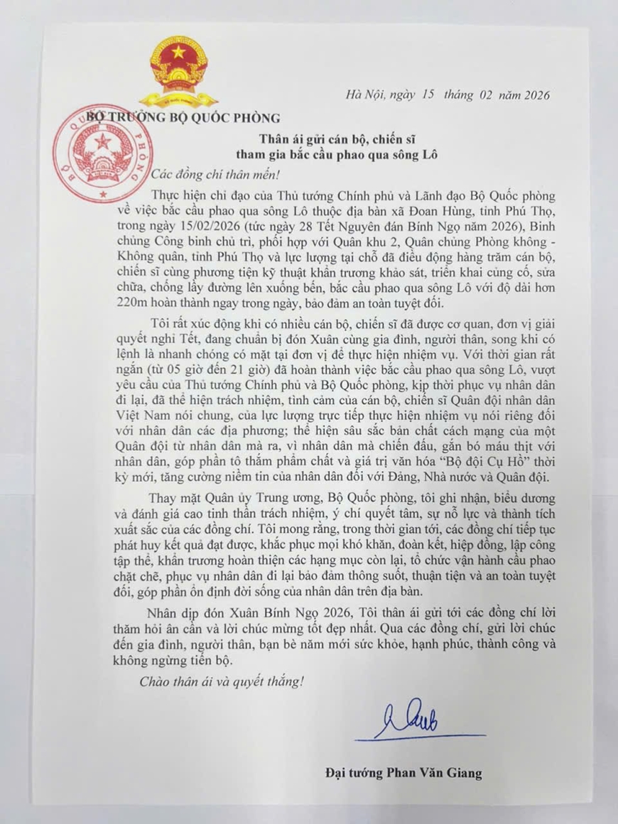| Đại tướng Phan Văn Giang gửi Thư biểu dương cán bộ, chiến sĩ tham gia bắc cầu phao qua sông Lô. |