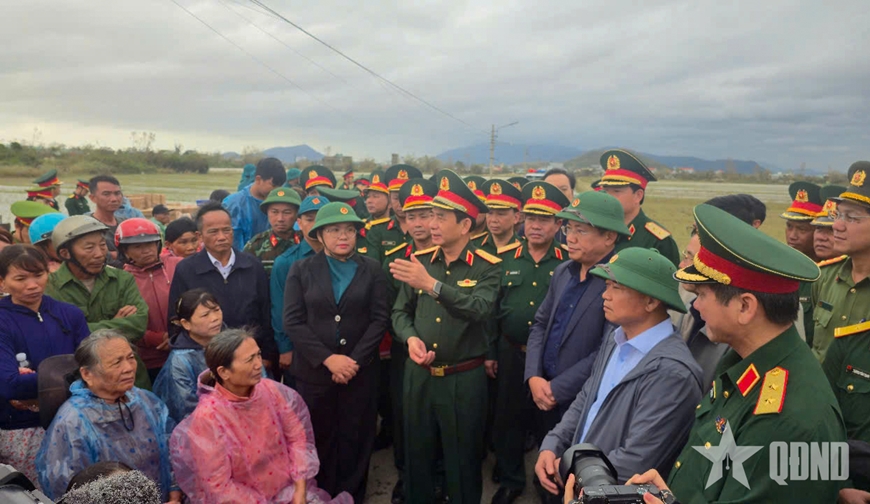 | Đại tướng Phan Văn Giang đi thăm các gia đình bị ngập sâu do mưa lũ. |