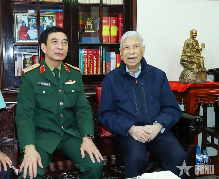 Chiều cùng ngày, đến thăm, tặng quà các đồng chí nguyên Bộ trưởng Bộ Quốc phòng: Đại tướng Phạm Văn Trà, Đại tướng Ngô Xuân Lịch; Trung tướng Đặng Quân Thụy, nguyên Phó chủ tịch Quốc hội, Đại tướng Phan Văn Giang ân cần hỏi thăm sức khỏe; đồng thời thông tin đến các đồng chí một số kết quả nổi bật về thực hiện nhiệm vụ quân sự, quốc phòng của toàn quân trong năm 2025.