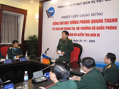 Phát biểu tại buổi làm việc, Bộ trưởng đã biểu dương tinh thần nỗ lực vượt khó vươn lên của cán bộ, nhân viên TCTBDV Việt Nam và đánh giá cao những đóng góp tích cực của Tổng công ty đối với sự phát triển kinh tế- xã hội của đất nước, đặc biệt là trong lĩnh vực phục vụ khai thác dầu khí; trong thực hiện nhiệm vụ bảo vệ chủ quyền quốc gia, bay tìm kiếm cứu nạn, bay MIA…Bộ trưởng yêu cầu trong thời gian tới, TCTBDV Việt Nam cần tiếp tục cố gắng, nỗ lực hơn nữa nhằm tiếp tục khẳng định vị thế ở tầm khu vực và châu lục; quan tâm chăm lo đời sống vật chất tinh thần và chú trọng đến công tác bồi dưỡng, nâng cao trình độ đội ngũ cán bộ, nhân viên, đặc biệt là đội ngũ phi công; làm tốt công tác phối hợp, hiệp đồng với các đơn vị bạn, nhất là Quân chủng Phòng không-Không quân. “Không chỉ coi trọng nhiệm vụ kinh doanh, Tổng công ty cần đặc biệt lưu ý đến công tác xây dựng Đảng”- Đại tướng Phùng Quang Thanh nhấn mạnh.