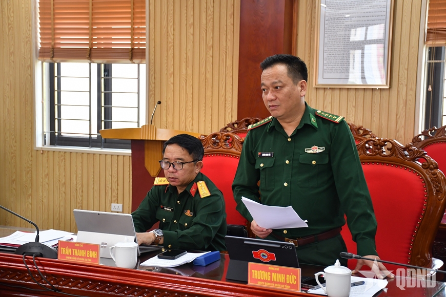 | Lãnh đạo Ban Chỉ huy Bộ đội Biên phòng tỉnh phát biểu tại hội nghị. |