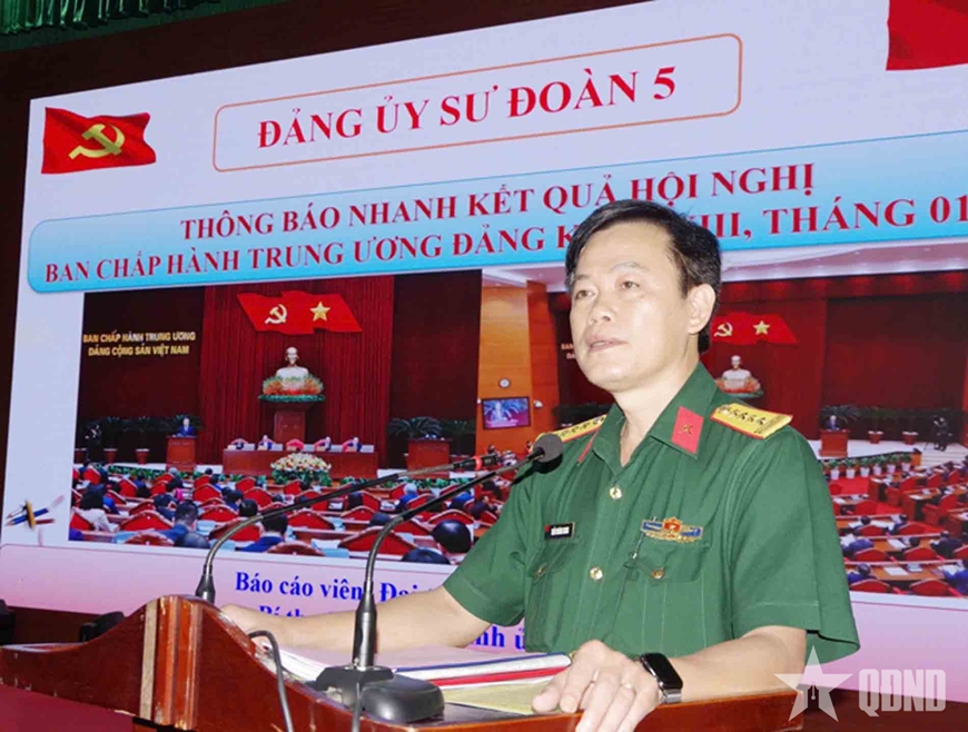 Trên cơ sở các nội dung đã quán triệt tại hội nghị, Đại tá Trần Hoàng Giang, Bí thư Đảng ủy, Chính ủy Sư đoàn 5 yêu cầu các cơ quan, đơn vị tổ chức phổ biến, quán triệt đến toàn thể cán bộ, đảng viên, quần chúng trong toàn Sư đoàn những nội dung cơ bản về kết quả của Hội nghị Ban Chấp hành Trung ương Đảng khóa XIII tháng 1-2025, nhằm thống nhất nhận thức, tư tưởng và hành động, quán triệt, triển khai thực hiện tốt các nghị quyết của Đảng, xây dựng Đảng bộ Sư đoàn trong sạch, vững mạnh, đơn vị vững mạnh toàn diện.