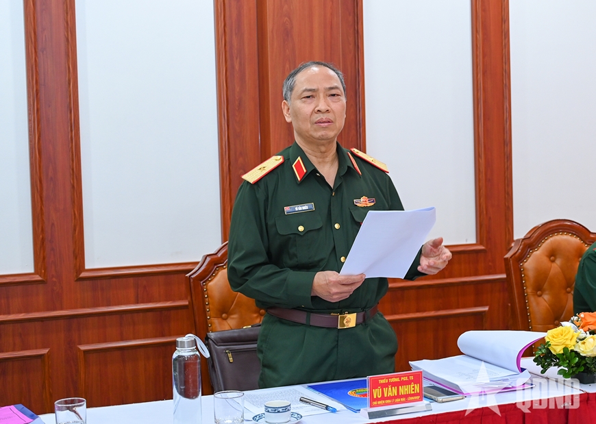 Thiếu tướng, PGS, TS Vũ Văn Nhiên, Chủ nhiệm Khoa Lý luận Mác - Lênin, Học viện Quốc phòng nhận xét đề tài. ẢNH: LÊ HIẾU