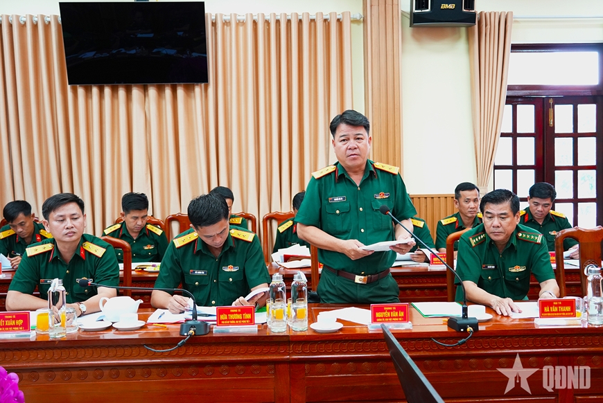 | Trung tá Nguyễn Văn Ân, Chính ủy Phòng thủ khu vực 1 (Bạc Liêu) phát biểu ý kiến tại hội nghị. |